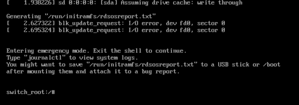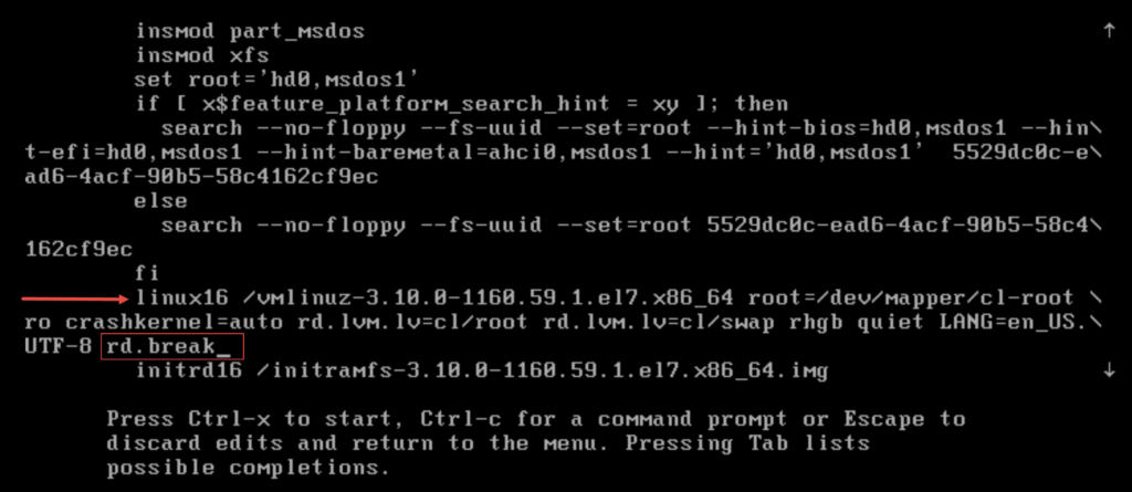 linux16 dan sonra başlayan kısımdaki yazılar mevcut kernel versiyonunuza göre değişiklik gösterebilir o yüzden lütfen başa bir müdahale yapmadan rd.break komutu eklendikten sonra klavyenizden CTRL + X komutunu uygulayarak Linux’un boot edilmesini sağlayınız