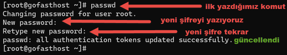 passwdkomutunu calıstırıp gelen satıra şifrenizi yazıp enter daha sonrasında aynı şifreyi tekrar yazıp enter’a basıyoruz ve sonrasında şifre başarıyla güncellenecektir.
