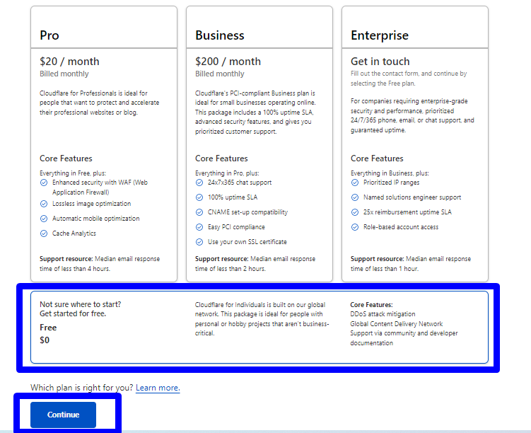 Karşınıza çıkacak fiyatlandırmalardan istediğinizi seçebilirsiniz ancak anlatımımızda Free plandan devam ediyoruz. Aşağıdaki gibi seçip Free planı seçiyoruz ve Continue butonuna basıyoruz.