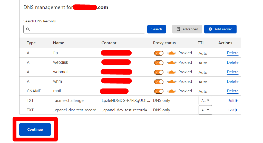 Tamamlandıktan sonra karşınıza DNS kayıtlarınız çıkacaktır ve Continue butonuna basıyoruz. Aşağıdaki görselde gösterilmiştir.
