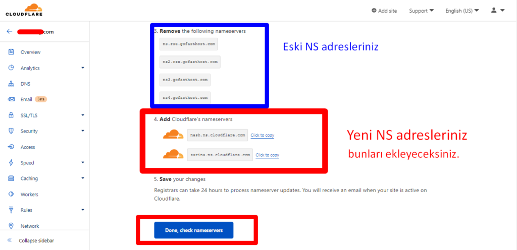 Artık yapmanız gereken Domain sağlayıcınızın Domain Yönetim panelinden NS adreslerinizi karşınıza çıkan NS sonuçları ile değiştirmeniz gerekiyor. Aşağıdaki görseldeki gibi gerekli NS yönlendirmelerinizi yapabilirsiniz. Ardından Done, check nameservers butonuna basıyoruz.