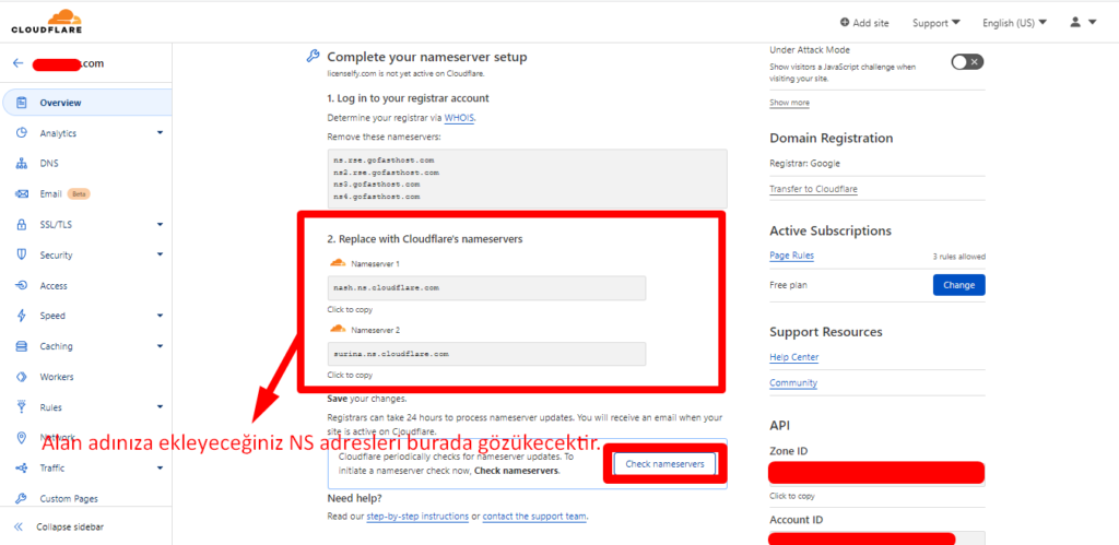 NOT: Burada dikkat etmeniz gereken NS adreslerinizi görseldeki gibi asla güncellemeyin! Cloudflare herkese farklı farklı NS adresleri ileticektir ona göre NS değiştirme yapabilirsiniz.
