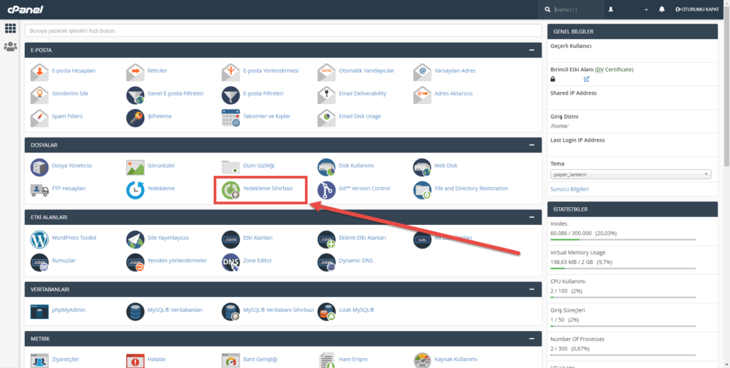 Öncelikle cPanel Kontrol Panel’imize giriş yapıyoruz ve ardından aşağıdaki görüntüdeki gibi Yedekleme Sihirbazı ikonuna tıklıyoruz.