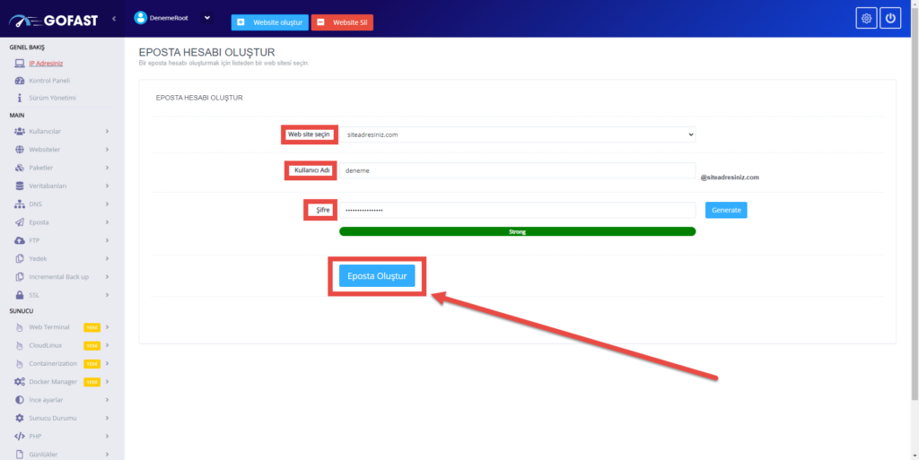 Kullanıcı adı: Burada ise örn: deneme@siteadresiniz.com gibi başındaki deneme kısmını kendi oluşturucağınız gibi değiştirebilirsiniz, örn: hello, hi, destek vs. istediğinizi yazabilirsiniz.