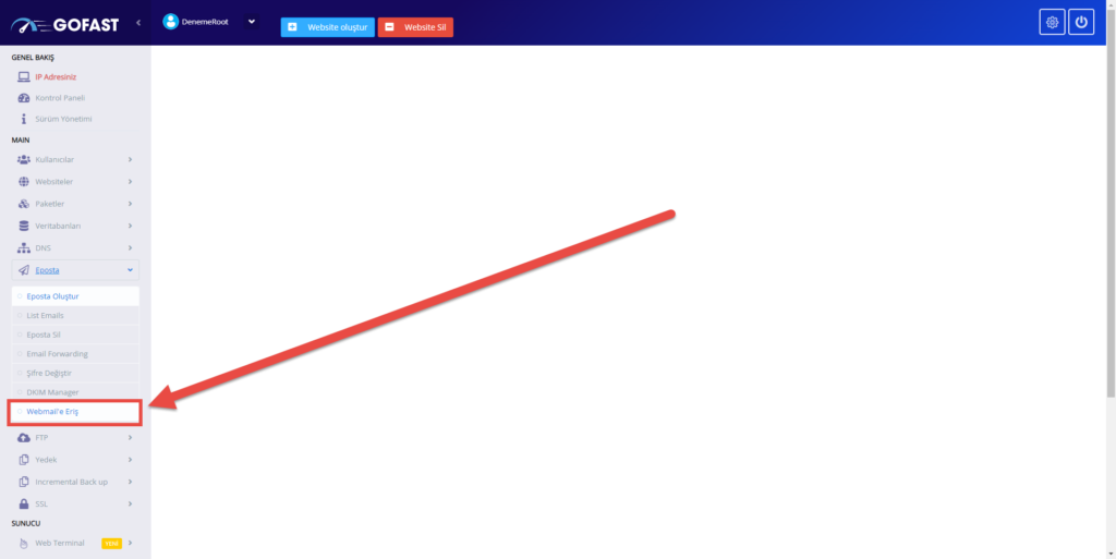 Ardından e-posta hesabımıza ulaşmak için Sol Menü’de bulunan E-Posta > Webmail’e Eriş kısmına tıklıyoruz.