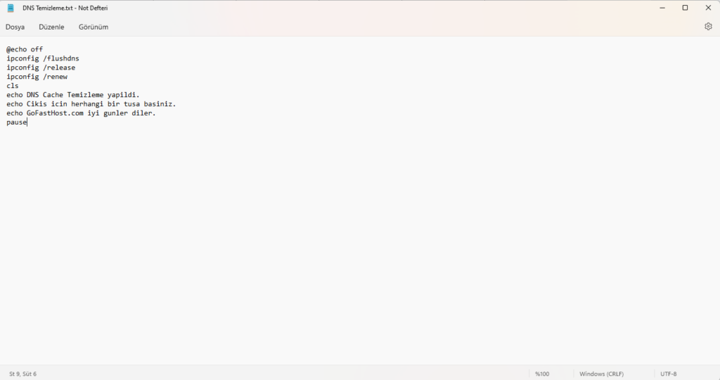Dosyamızın ismini de DNS Temizleme koyabiliriz veya istediğiniz ismi de koyabilirsiniz.