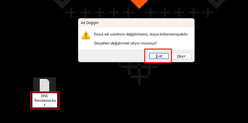 Ardından .txt dosya uzantımızı .bat olarak değişitiriyoruz.