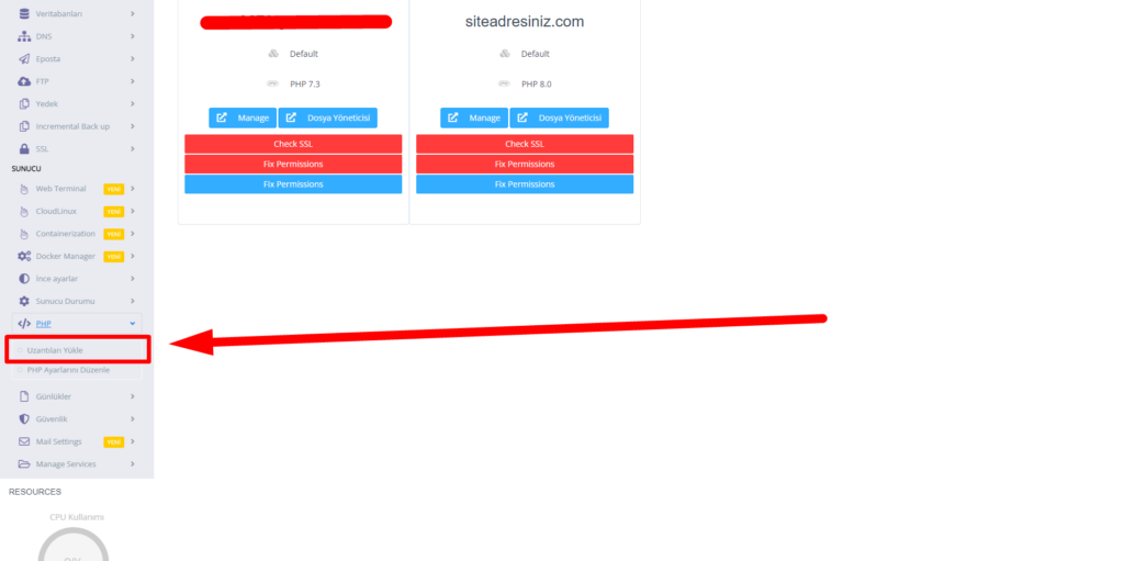 Giriş yaptıktan sonra karşımıza çıkan anasayfadaki sol panelden aşağıya doğru iniyoruz ve PHP menüsünde bulunan “Uzantıları Yükle” seçeneğine tıklıyoruz.