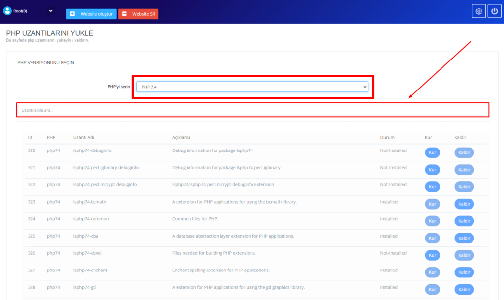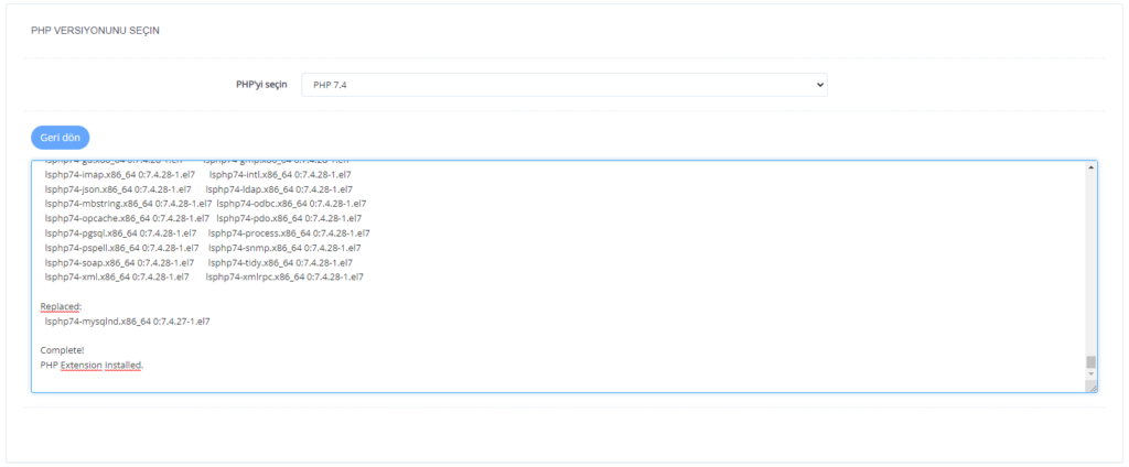 Ardından karşımıza çıkan PHP Uzantıları Yükle sayfasından sitemiz için gerekli olan uzantıya ait PHP sürümlerinden birini seçiyoruz. PHP 7.4 veya PHP 8 siteniz ile aynı kullanım olmasına dikkat ediniz.
