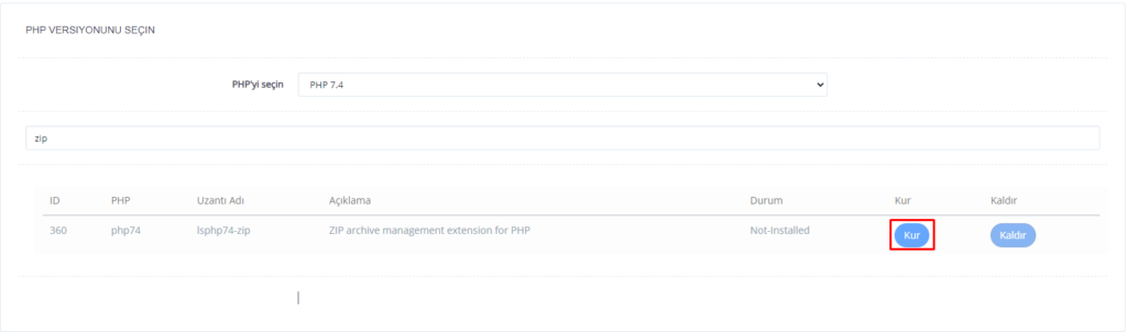 Sonra bizim için gerekli olan uzantıyı arama kısmına yazıyoruz. Örn: php zip uzantısını yükleyebiliriz.