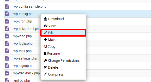Dosya Yöneticisi’ne girdikten sonra /public_html/ klasörümüze giriyoruz yani sitemizin bulunduğu ana dizine giriş yapıyoruz, /public_html/wp-config.php dosyamızı buluyoruz ve sağ tık yapıp Edit diyoruz.