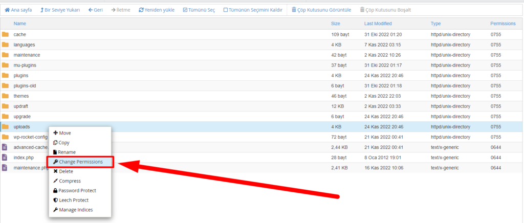 Öncelikle tekrardan Dosya Yöneticisi’ne giriş yapıyoruz ve orada public_html/wp-content/**uploads** dosyamızın üzerine mouse ile sağ tık yapıyoruz ve açılan menüde Change Permissions kısmına tıklıyoruz.
