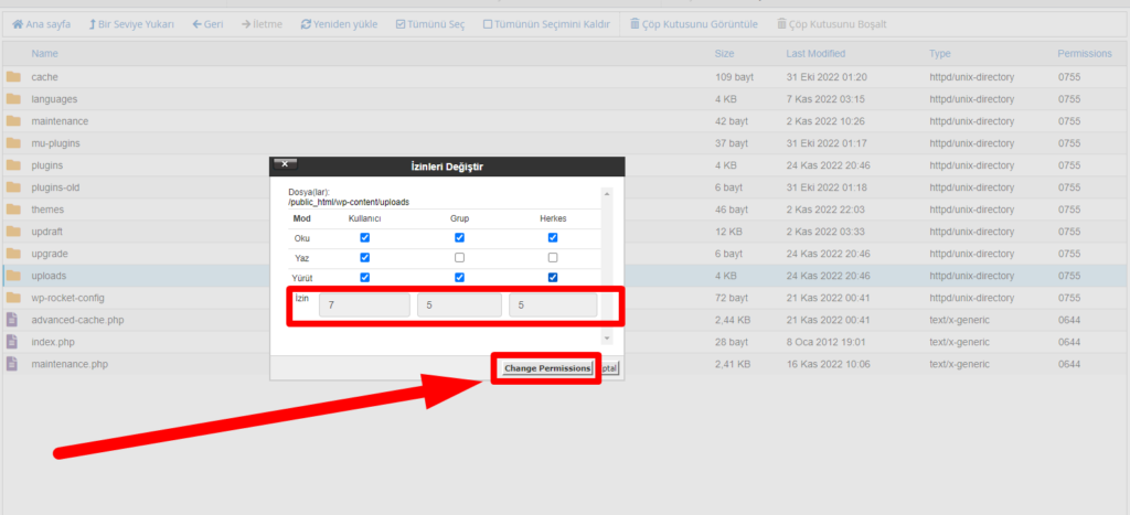 Ardından açılan Change Permissions yani İzinleri Değiştir pop-up’nda bulunan izinleri 755 olarak ayarlıyoruz.