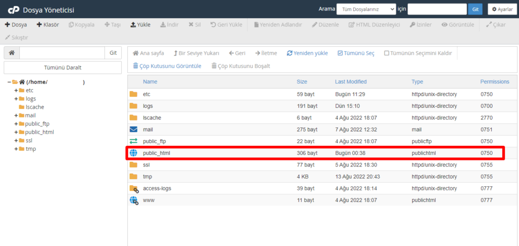 Dosya Yöneticisi’ni açtıktan sonra public_html dosyasına girmek için üzerine tıklıyoruz ve dosyanın içerisine giriş yapınız.