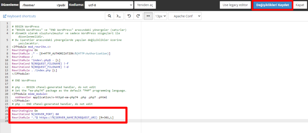 Görselde gördüğünüz şekilde .htaccess dosyasını HTTP to HTTPS yönlendirme kodunu ekledikten sonra “Değişiklikleri Kaydet” butonuna basıyoruz ve artık sitenizde SSL ile birlikte açıldığını fark edeceksiniz.